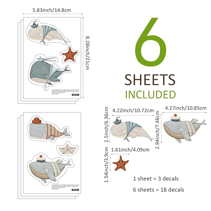 Whale Wall Decals for Nursery – 18 Decals, Ocean Theme Removable Stickers for Kids Room, Sea Animal Baby Room Decor, Reusable Wall Stickers for Furniture & Glass (6 Sheets)