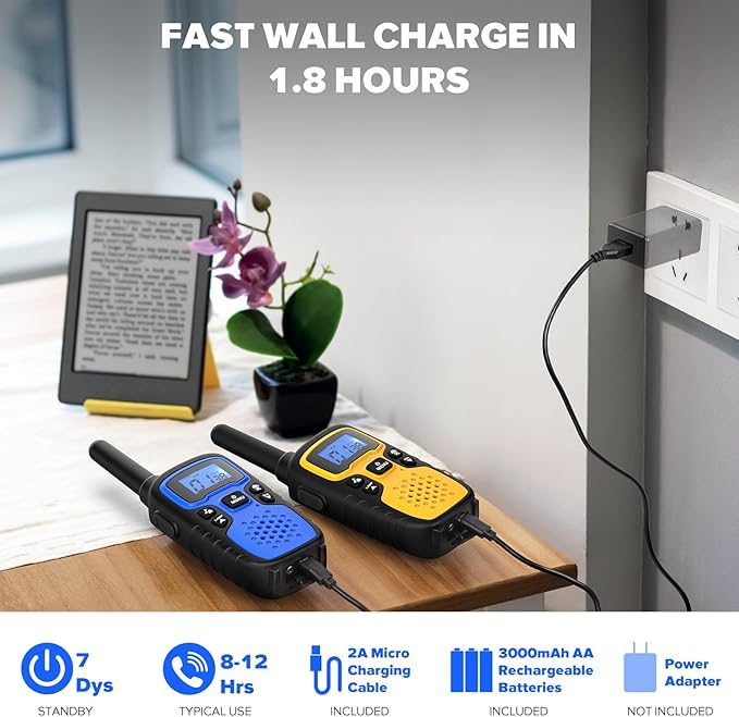 • UNLIMITED COMMUNICATION TIME — The rechargeable walkie talkie supports micro USB charging. You can charge them indoors, on the road, and even camping and hiking, and you do not need to pay for batteries, again and again, saving stress and money for you.