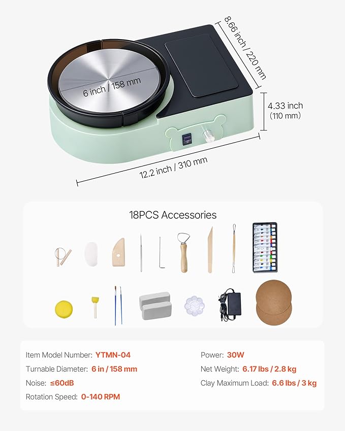 • Mini Pottery Wheel: This mini pottery wheel for kids and adults features a powerful 30W motor and a 6 in aluminum alloy turntable. Durable and stable, it supports up to 6.6 lbs of clay—ideal for different ages to explore ceramic creativity