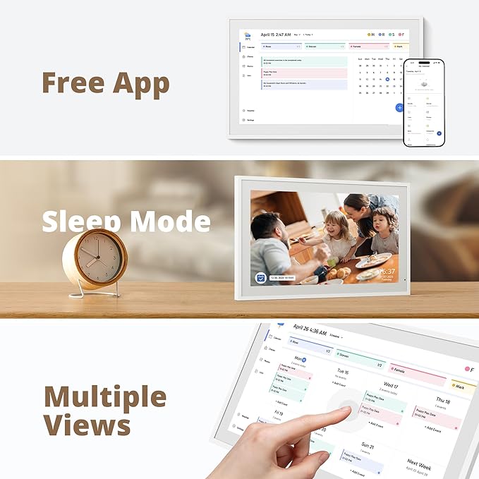 • 【Easy Setup and Auto-Sync】: Enjoy a user-friendly design that our smart picture frame allows for quick setup—just plug in, connect to Wi-Fi, and link your calendar to the Mobile App. Once synced, it seamlessly integrates multiple personal calendars (iOS, Google, etc.) into one unified interface. Authorize additional devices for even greater convenience.