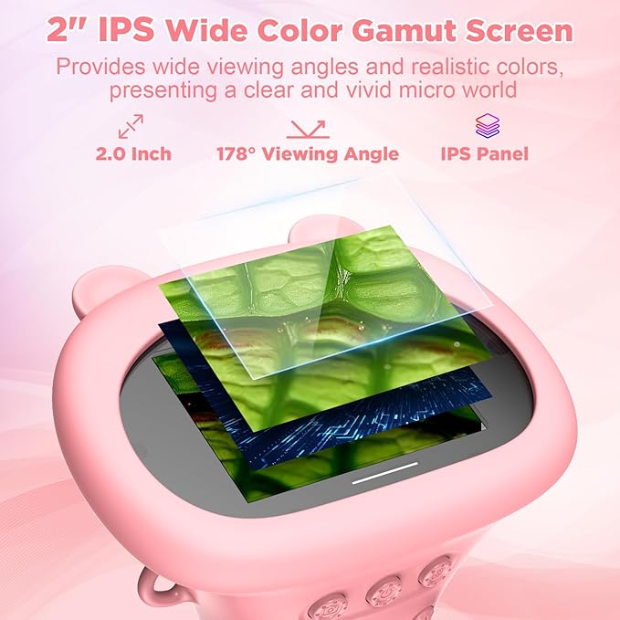 • Clear 2.0'' IPS Display: The digital microscope features a vivid 2.0 inch IPS screen with a wide 178° viewing angle, providing bright, eye-friendly visuals. Kids can enjoy real-time observation without straining their eyes during everyday exploration and play