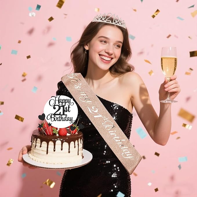 • 21st Rhinestone Crown & Sparkly Sash: The birthday sash, made of soft fabric via hot-press stamping glitter technique, features superior quality with non-shedding glitter and rose gold It's my 21st Birthday letters. The crown, crafted from sturdy hard alloy with dazzling rhinestones, is meticulously designed for 21st birthday parties.