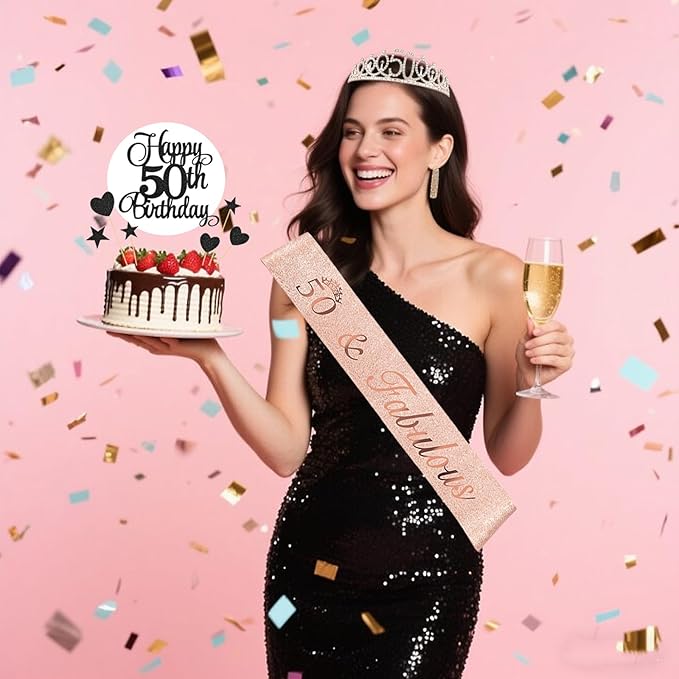 • 50th Rhinestone Crown & Sparkly Sash: The birthday sash, made of soft fabric via hot-press stamping glitter technique, features superior quality with non-shedding glitter and rose gold 50&Fabulous letters. The crown, crafted from sturdy hard alloy with dazzling rhinestones, is meticulously designed for 50th birthday parties.