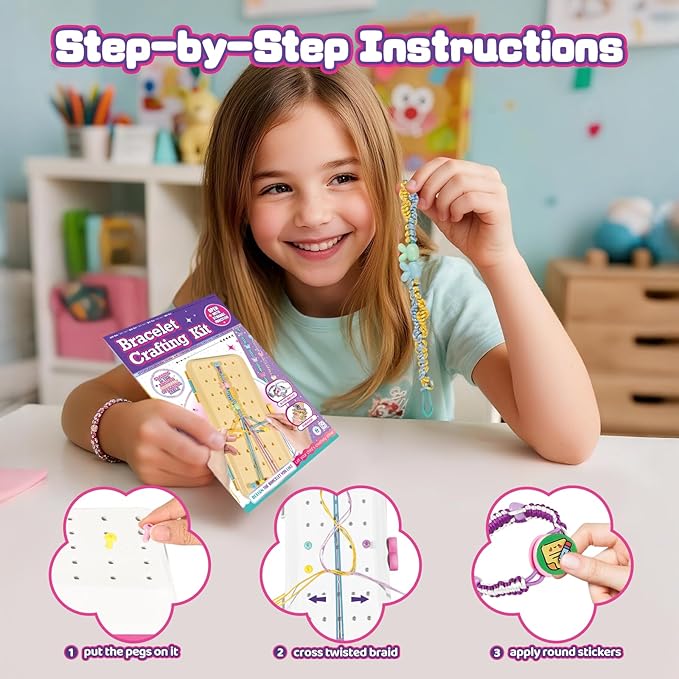 • Friendship Bracelet Making Kit:Our friendship bracelet kit includes 26 bundles of bracelet string,25 buttons, 25 elastic strings, 30 pins, 32 colorful beads, stickers, and non-slip pads for easy crafting. With the step-by-step illustrated guide, using the friendship bracelet maker, kids ages 6 and up can effortlessly craft their own unique friendship bracelets and enjoy endless creative fun