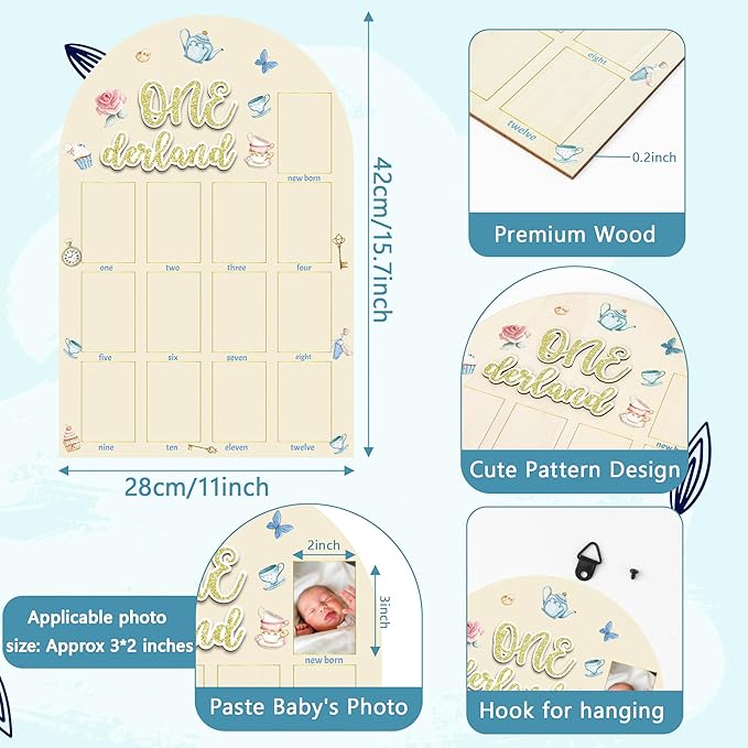 • Onederland Tea Party Display Wood Board: Our 1st Birthday Frame comes with hanging hooks and adhesive points, making it easy for you to mount and decorate. Crafted from durable, premium wood, it's designed for longevity. Adorned with your baby's photo, this onederland tea party frame will undoubtedly become a stunning focal point at your child's first birthday celebration.