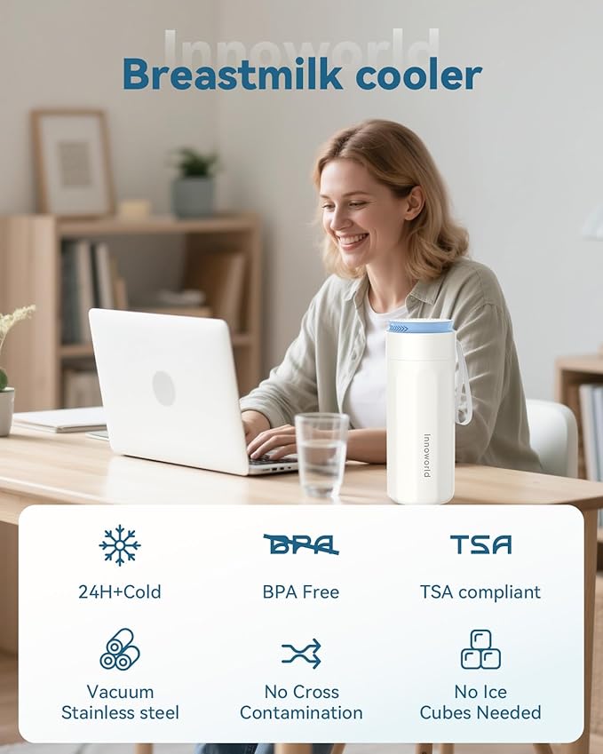 • 360° Stainless Steel Cooling Tube for 24 Hours+ of Cooling: Innoworld breastmilk cooler features an upgraded 360° stainless steel cooling tube(no ice cubes needed) and vacuum-insulated stainless steel body, ensuring breast milk stays consistently cold for 24 hours+, Perfect for preserving breast milk safely during outdoor activities, travel, or daily use
