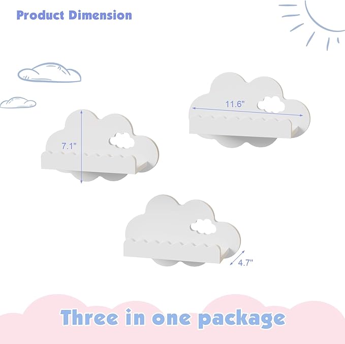 • 3-Piece White Floating Wall Shelves: You'll receive a set of 3 nursery-themed shelves, each designed to unlock endless versatility. These white wall shelves can be arranged and used in diverse ways throughout your home—whether as a kids' book nook to organize storybooks, a display spot for tiny toys, or a charming accent to showcase photos. With their playful cloud-inspired design, this 3-piece set isn't just functional storage; it’s a standout wall decor piece that elevates the vibe of any room, from the nursery to the playroom.