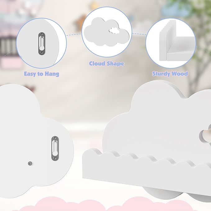 • Scalloped Cloud Floating Shelves: Perfect for Nursery & Kids Room, Versatile for Any Space These 3-piece white cloud wooden shelves aren’t just for nurseries—mount them effortlessly in your toddler’s room, playroom, kids’ bedroom, or even the living room to add a playful touch! Designed to keep little ones’ essentials organized, they’re ideal for stowing books, toys, stuffed animals, and games, lifting clutter off the floor while keeping items within your child’s easy reach. Easy to mount and charming by design, they blend decor and functionality seamlessly.