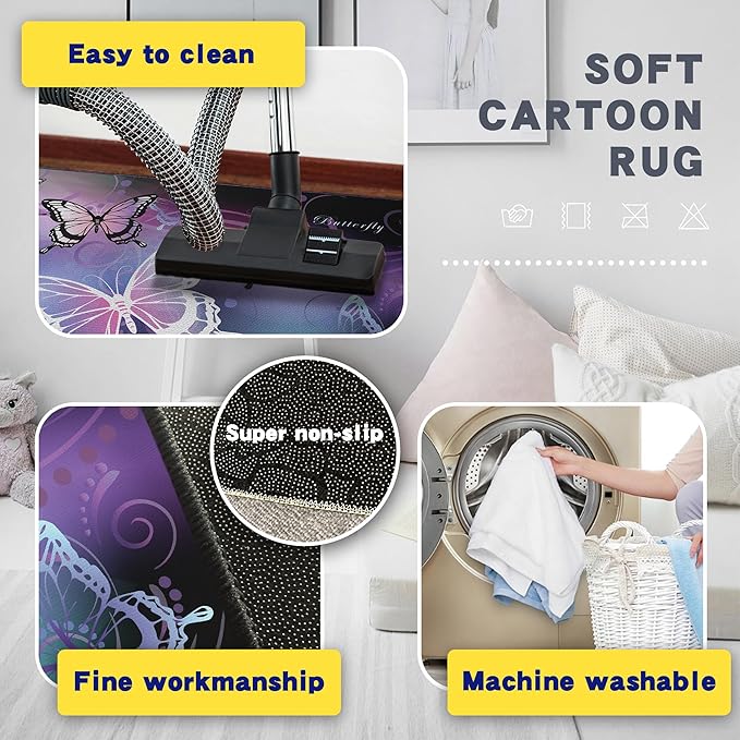 Beautiful Butterfly Fantasy Rug for Playroom Girls Bedroom Colorful Rainbow Butterfly Decor Area Carpet 3x4 Purple Mat 3D Printed Non-Slip Washable