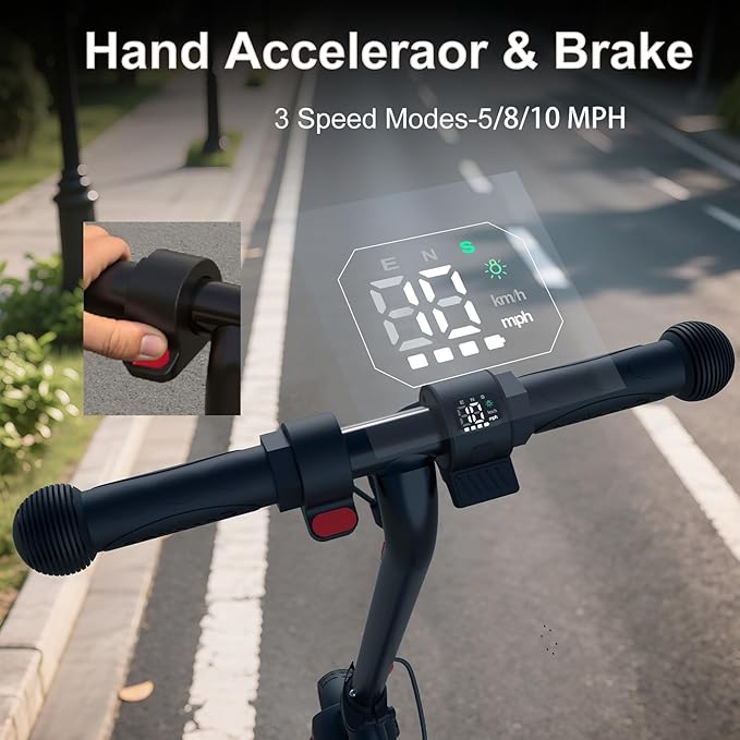 • ✨ Hand Accelerator & Brake: Caroma E6 electric scooter for kids features hand-operated acceleration and braking for safe, easy riding. Simply kick-start to 3 mph, then press and hold the throttle for smooth acceleration. The reliable dual-brake system ensures confident stopping power in any riding condition.