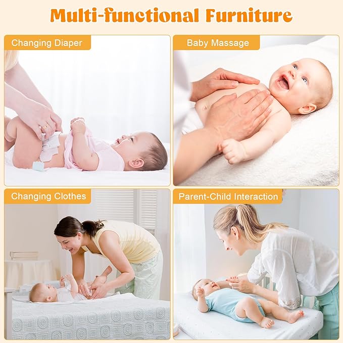 • Durable & Baby-Safe Design – Constructed from scratch-resistant, water-resistant MDF board for long-lasting use and effortless cleaning. The reinforced, elevated legs protect against moisture, while the soft-rounded edges minimize injury risks. Includes a sturdy anti-tip kit for added stability and peace of mind.
