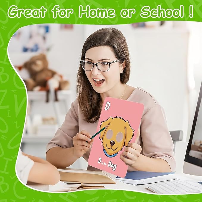 • 【 Fun Cards】 This set includes 26 oversized letter cards, 7 inches by 8.6 inches, from A to Z. Each card has a fun cartoon character and bright colors to help learn uppercase and lowercase letters, spelling, and recognizing animals