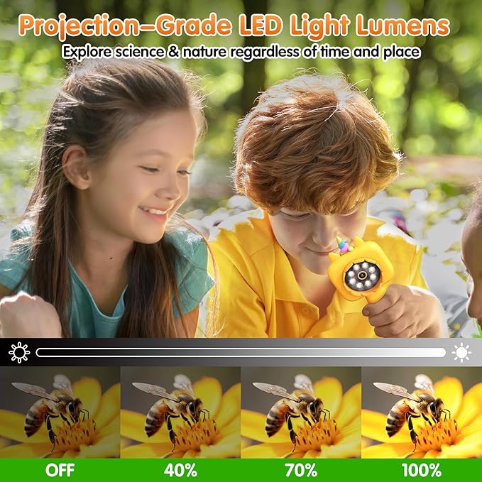 • 🔬【Projection-level lumen LED】8 LED lamp beads with 3 levels of adjustment provide projection-level lumen brightness, ensuring that the images and videos of the magnifying glass with light are clear and bright. Even in low light conditions outdoors at night, children can get the best observation effect, stimulating their curiosity and desire to explore.