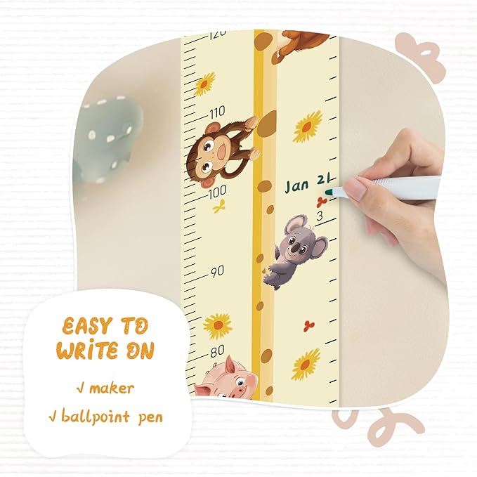 • Design: Kids growth chart with rope at the top of the chart, easy to install and removeable, foldable and portable design, easy to store, hang, roll up, transport, and save space. It boasts a material that's easy to write on, where you can use dark colored ballpoint pens and markers to track growth milestones.