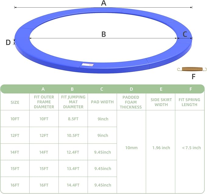 • 【Rich Configuration】Our trampoline mats come in four colors: blue, black, purple, and gray, and five sizes: 10ft, 12ft, 14ft, 15ft, and 16ft, to meet the needs of most trampolines.