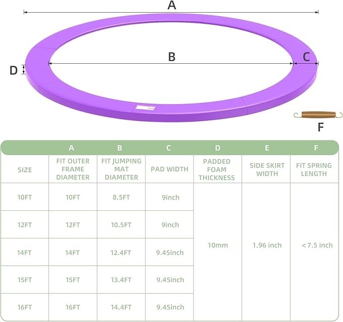 • 【Rich Configuration】Our trampoline mats come in four colors: blue, black, purple, and gray, and five sizes: 10ft, 12ft, 14ft, 15ft, and 16ft, to meet the needs of most trampolines.