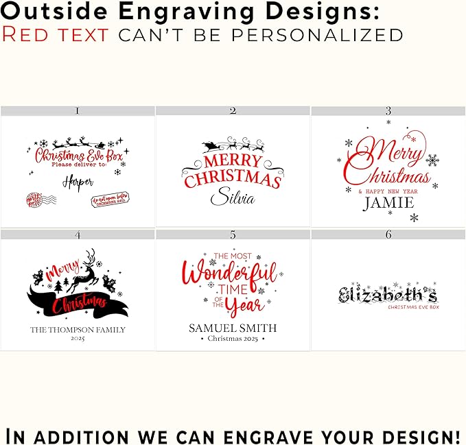 • Personalized: Kids Christmas eve box can be engraved with designs we offered adding the child's name, names, family name, year to make it unique. We’ll use the font style showcased in the photos. Additionally, it can be engraved inside, on the other lid's side, to create a surprise message for the recipient. Different font options for inside engraving.