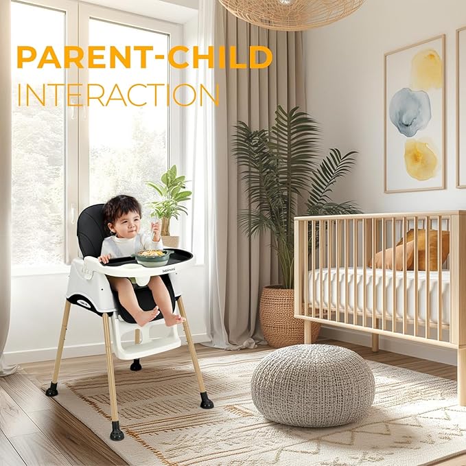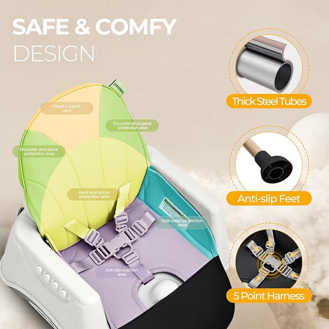 • Multiple Safety Protections: Sturdy steel tubes and a golden triangle design prevent tipping. The adjustable 5 point harness high chair ensures your baby’s safety, making this highchair a top choice for parents.