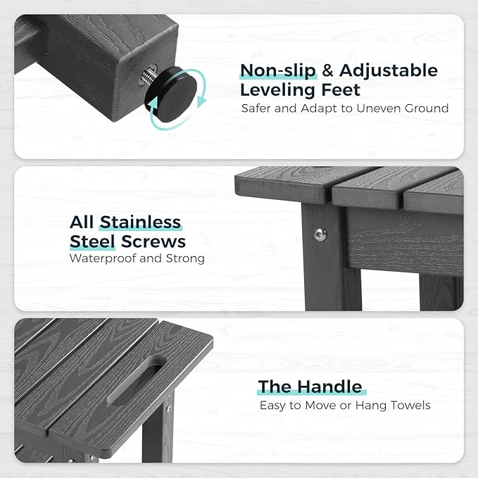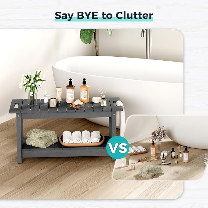 • 【100% Waterproof】 The shower bench is made of HIPS (poly lumber), with 304 stainless screws, which is highly water proof, never rot and moldy. Easy to clean, just wipe it with a towel.
